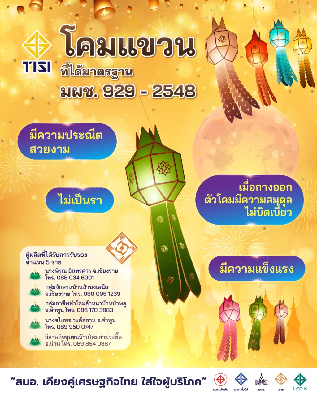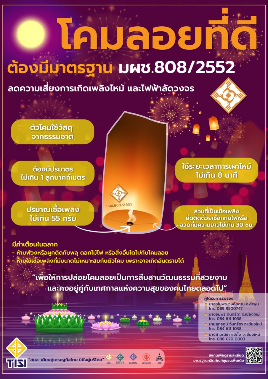 “หากต้องการสั่งซื้อกระทง โคมลอย และโคมแขวน ที่ได้มาตรฐาน มผช. สามารถติดต่อได้ที่หมายเลขโทรศัพท์ดังกล่าวข้างต้น หรือ จะสั่งซื้อผ่านทางแพลตฟอร์มชอปปิงออนไลน์ที่จำหน่ายอยู่ในขณะนี้ เพื่อสนับสนุนสินค้าจากชุมชน ทั้งนี้ ก่อนซื้อให้สังเกตเครื่องหมายมาตรฐานผลิตภัณฑ์ชุมชนที่สินค้า หรือบรรจุภัณฑ์ด้วย เพื่อการันตีคุณภาพ ความปลอดภัย และไม่ส่งผลกระทบต่อสิ่งแวดล้อม” เลขาธิการ สมอ. กล่าว