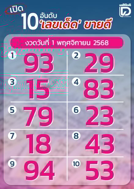 เมื่อจัดลำดับความนิยมของเลขดัง 10 อันดับ พบมีดังนี้ อันดับ 1 เลข 93 อันดับ 2 เลข 29 อันดับ 3 เลข 15 อันดับ 4 เลข 83 อันดับ 5 เลข 79 อันดับ 6 เลข 23 อันดับ 7 เลข 18 อันดับ 8 เลข 43 อันดับ 9 เลข 94 และ อันดับ 10 เลข 53